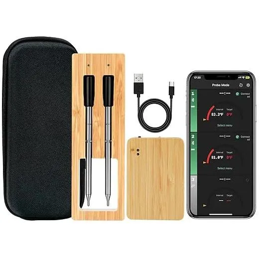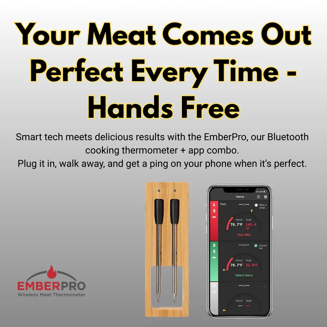 That's why we are so excited to bring you this special product - the EmberPro Wireless Meat Thermometer - where the lowest of low tech - meats - meets high tech. Just insert one the EmberPro probes into your steak, hamburger or chops and then go off and mingle with guests. Don't need to hang around the oven, your phone will alert you when it's perfectly done.